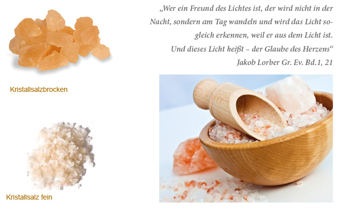 Natürliches Kristallsalz sollte vor allem ein Lebensvermittler sein, der dem Organismus messbare Informationen in Form von Energie zuführt, welche die natürliche Regulationsfähigkeit des Körpers (Homöostase) anregt. Damit dieses natürliche Frequenzspektrum nicht negativ beeinflusst wird, sollte Kristallsalz in keiner Form industriell bearbeitet oder verändert werden. Eine Bearbeitung von Hand ist somit obligatorisch. Auch sollte ein Nachweis der im Kristallsalz enthaltenen 84 Elemente vorliegen, jener 84 Elemente, die auch im menschlichen Körper vorkommen.